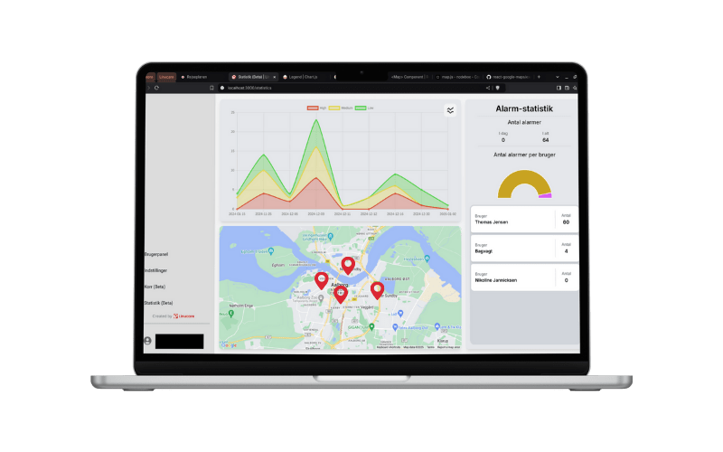 Fra vores administrationspanel kan I nemt styre hele systemet. Se status på alle alarmer i realtid, administrer brugere og alarmgrupper, og få værdifuld indsigt i jeres beredskab. Systemet giver jer det fulde overblik, så I altid er på forkant og kan dokumentere jeres sikkerhedsindsats.